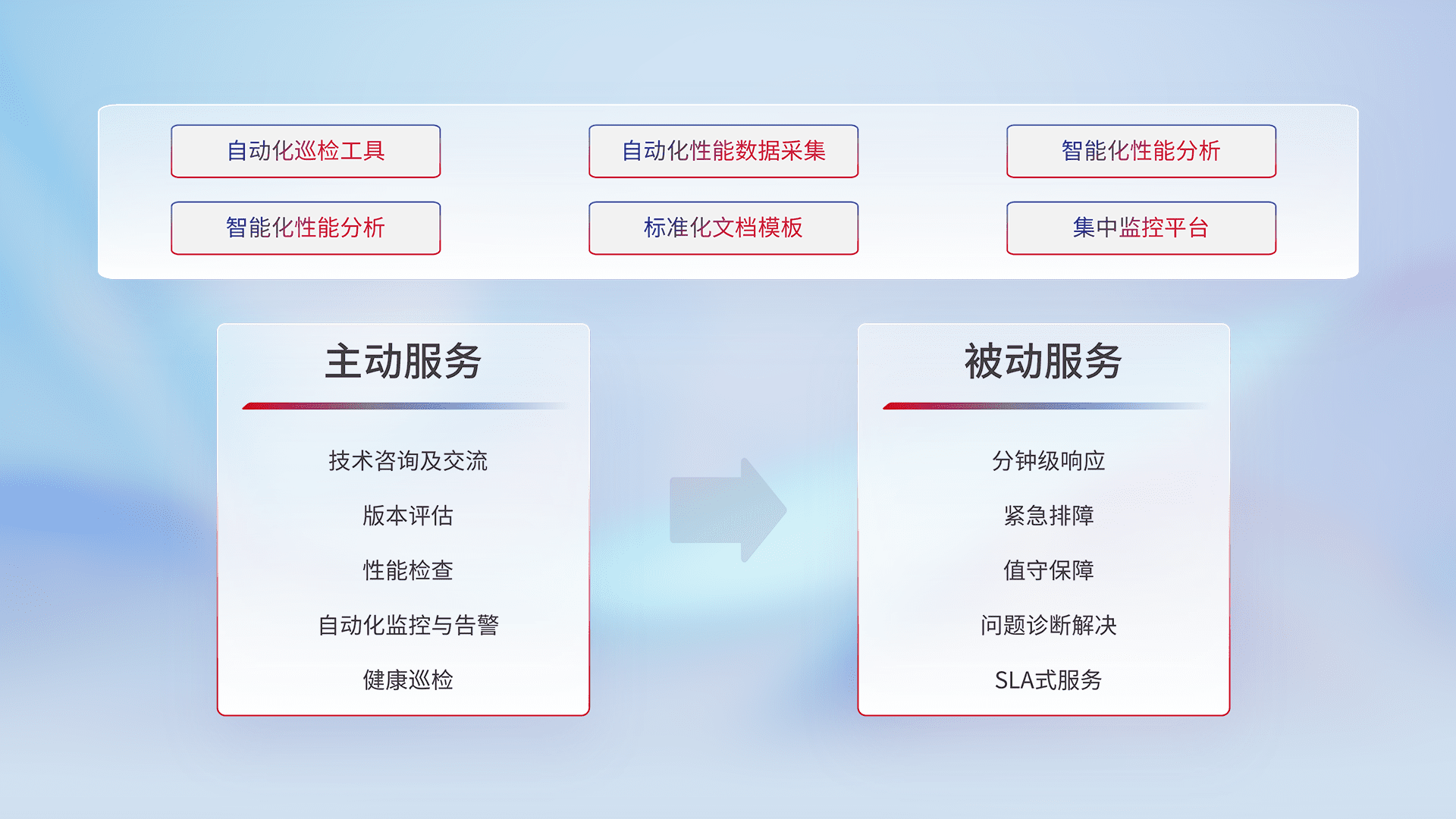 智能化工具和标准化文档,,,,保障服务质量,,,,提供主动服务(包含技术咨询、、版本评估、、、性能检查、、自动化监控与告警、、健康巡检)和被动服务包含(分钟级响应、、、、紧急排障、、、、值守保障、、、、问题诊断解决、、、SLA服务)。。